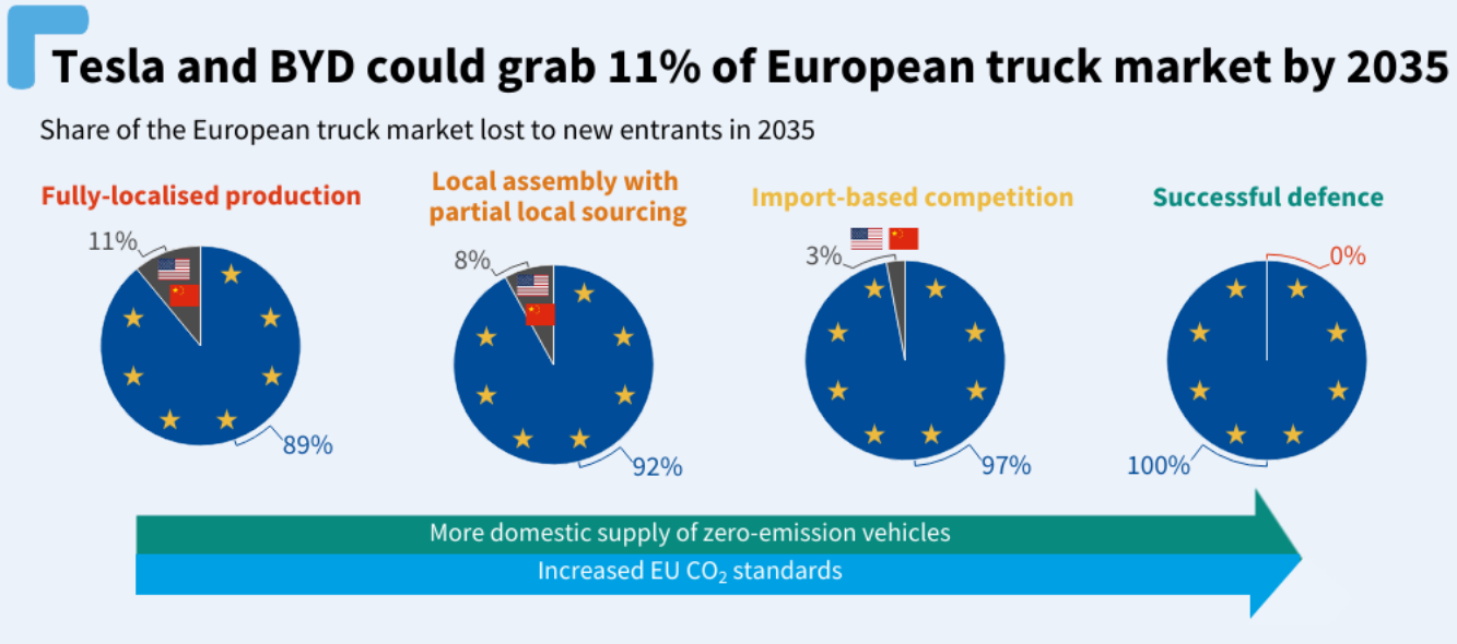 I produttori di autocarri europei potrebbero perdere l’11% del mercato Ue a favore dei rivali elettrici internazionali entro il 2035.