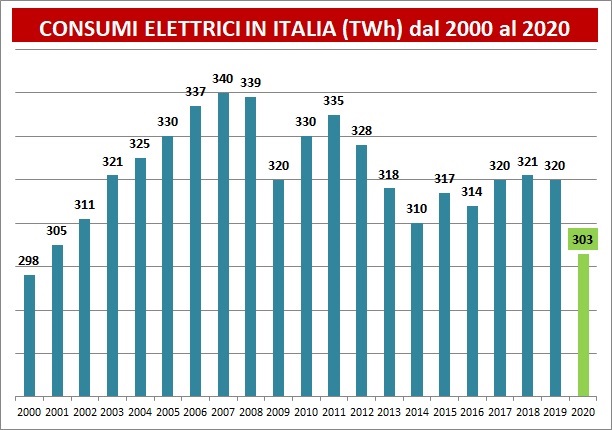Colpisce lo scalino del 2020 rispetto ai dati dei consumi elettrici del Paese degli ultimi 20 anni. Per ritrovare una domanda più bassa dobbiamo tornare al 2000.