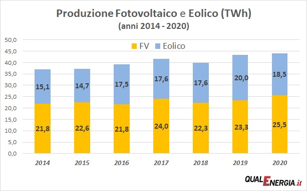 Insieme, eolico e fotovoltaico producono nel 2020 circa 44,4 TWh, cioè appena +0,7 TWh sul 2019. Entrambe le fonti coprono così il 14,5% della domanda annuale (nel 2019 erano, insieme, al 13,6%).