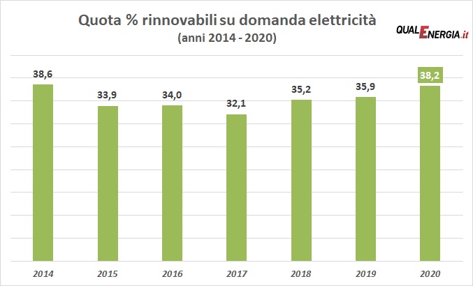 Nel grafico la quota delle rinnovabili sulla domanda elettrica dal 2014 al 2020: il dato di quest’anno è inferiore solo al 2014, anno con una notevole produzione da idroelettrico.