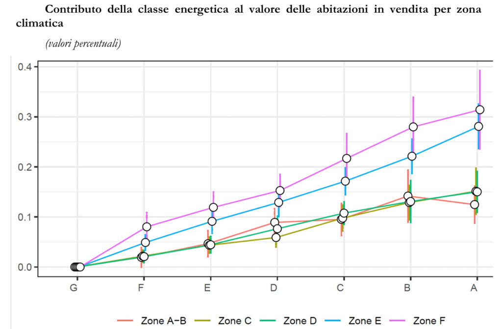 Stando alle stime dell’Enea, nel 2022 in Italia il 53% delle abitazioni era nelle classi energetiche più basse, F e G, mentre solo il 12% era ad alta efficienza (classi da A1 a A4); la ricerca pubblicata dalla Banca d’Italia (M. Loberto, A. Mistretta e M. Spuri, The capitalization of energy labels into house prices. Evidence from Italy, link in basso) ha analizzato un campione di abitazioni con una composizione analoga (circa il 10% tra A1 e A4 e 65% tra F e G) messe in vendita in Italia tra il 2018 e il 2022 su Immobiliare.it.