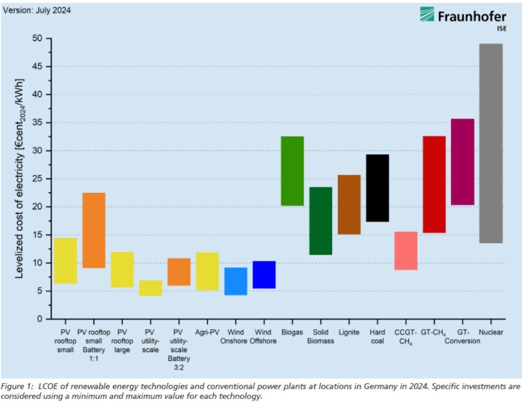 Ma soprattutto, a differenza di quanto si legge nel report, il fotovoltaico con batteria, cioè con produzione programmabile, oggi costa già meno del nucleare convenzionale e anche di quel che potrebbero costare, forse, soluzioni come gli SMR un domani, come mostra l‘ultimo report sugli LCOE del Fraunhofer Institute.