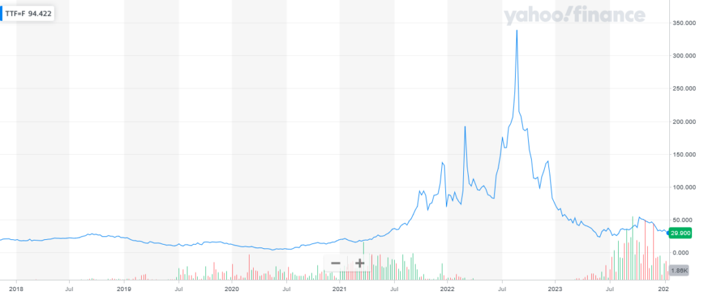 Mentre scriviamo, le quotazioni sull’indice di riferimento olandese TTF sono sotto i 30 euro/MWh: sono cioè a livelli pre-crisi, dato che da giugno 2021, con l’eccezione della primavera 2023, i prezzi sono sempre stati superiori a quel valore (con punte che hanno sfiorato i 340 €/MWh ad agosto 2022, si veda grafico sotto da Yahoo Finance).