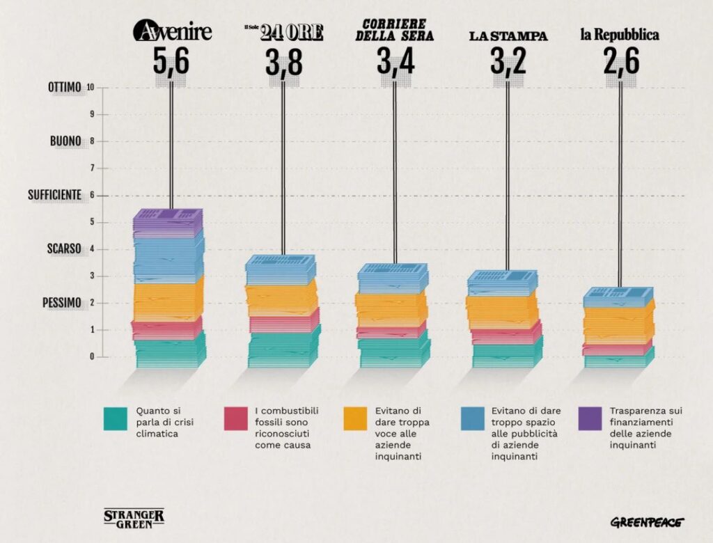 Lo mostra la classifica che esce dall’ultima edizione del rapporto di monitoraggio curato dall’Osservatorio di Pavia per conto di Greenpeace, nella quale per ogni media si considera quanto si parla di crisi climatica, in quanti articoli i combustibili fossili sono riconosciuti come causa, quanta voce si dà alle aziende delle fossili, quanta pubblicità si fa alle stesse e se c’è trasparenza sui finanziamenti che arrivano al giornale da questi settori.