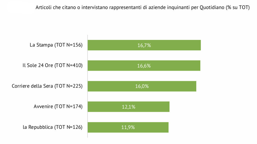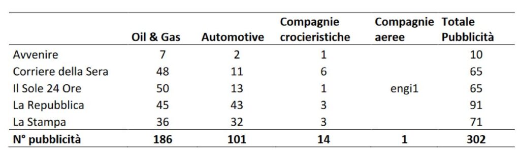 Interessante poi anche il monitoraggio sulla pubblicità che i quotidiani raccolgono dalle aziende con maggiori impatti sul clima: quelle dell’energia attive anche nei combustibili fossili, quelle del settore automotive, compagnie aeree e crocieristiche.