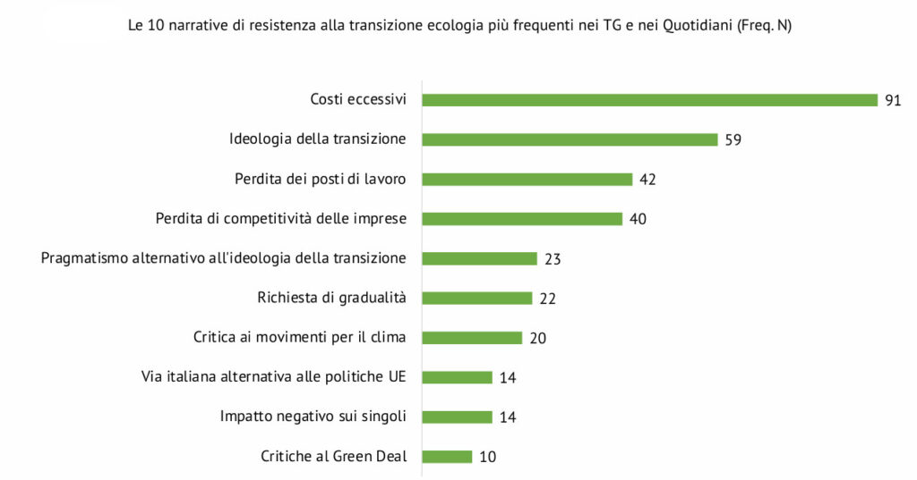 Uno spazio rilevante viene dato a chi si oppone alla transizione energetica: il 19,2% delle notizie di quotidiani e TG contiene critiche o resistenze ad azioni per il clima e in proporzione le posizioni critiche sono più frequenti nei TG (25,5% contro il 17,5% dei quotidiani).