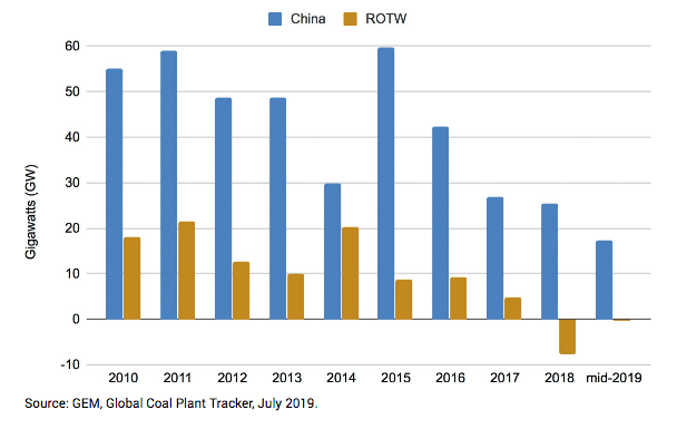 Al contrario, nel resto del mondo questa fonte fossile ha perso in totale circa 8 GW di capacità netta installata, perché in molti paesi si stanno costruendo meno impianti e si stanno chiudendo quelli esistenti (alcuni governi hanno deciso di chiuderli nei prossimi anni, ad esempio Italia e Germania). In altre parole, le dismissioni delle vecchie unità a carbone hanno superato le aggiunte di potenza.