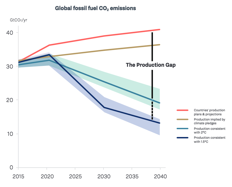 I paesi, infatti, da qui al 2030 andrebbero a produrre il 50% di fonti fossili in più rispetto al livello di produzione “accettabile”, quello cioè in linea con l’obiettivo di limitare a 2 gradi il surriscaldamento globale. E addirittura il 120% in più se si prende come riferimento l’obiettivo di limitare il global warming a +1,5 gradi.