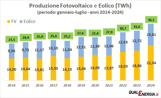 Insieme fotovoltaico ed eolico hanno prodotto 36,1 TWh, il massimo di sempre per il periodo considerato, come si può vedere dal grafico dal 2014 ad oggi.