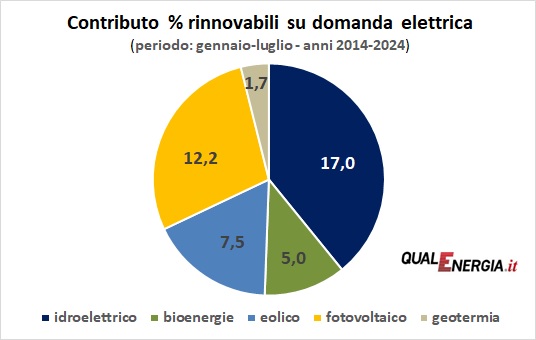 Nel grafico più in basso le quote di contributo delle diverse fonti rinnovabili sul fabbisogno elettrico in Italia da gennaio a luglio 2024.