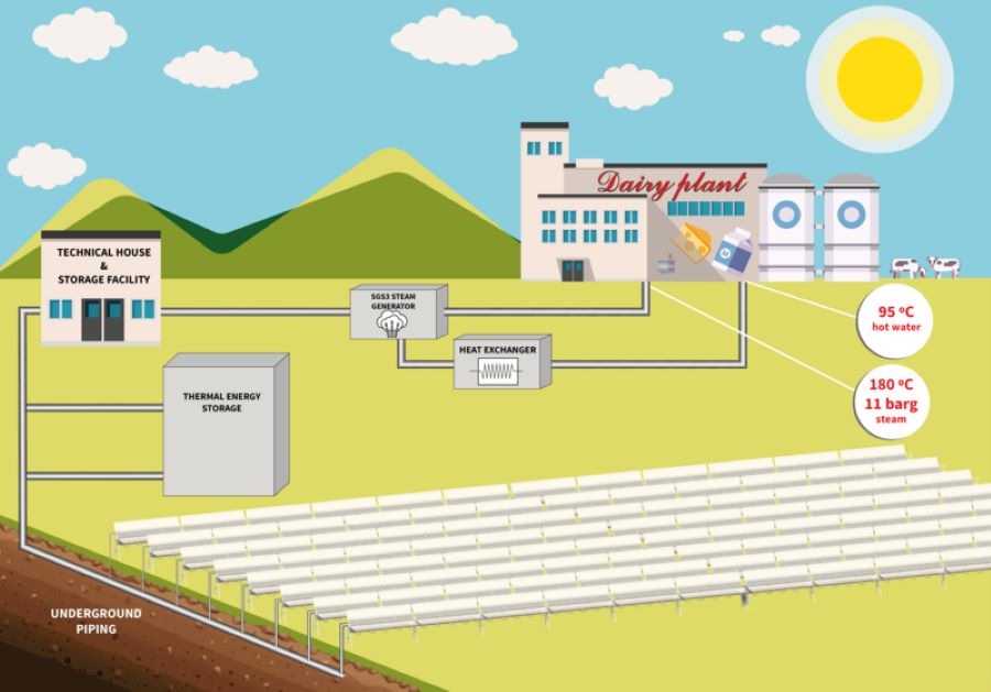 Il sistema solare termico è accoppiato a un serbatoio di accumulo del calore con una capacità di 1.000 metri cubi che, in inverno, può essere utilizzato anche per immagazzinare l’energia termica proveniente dalla vicina centrale di cogenerazione.