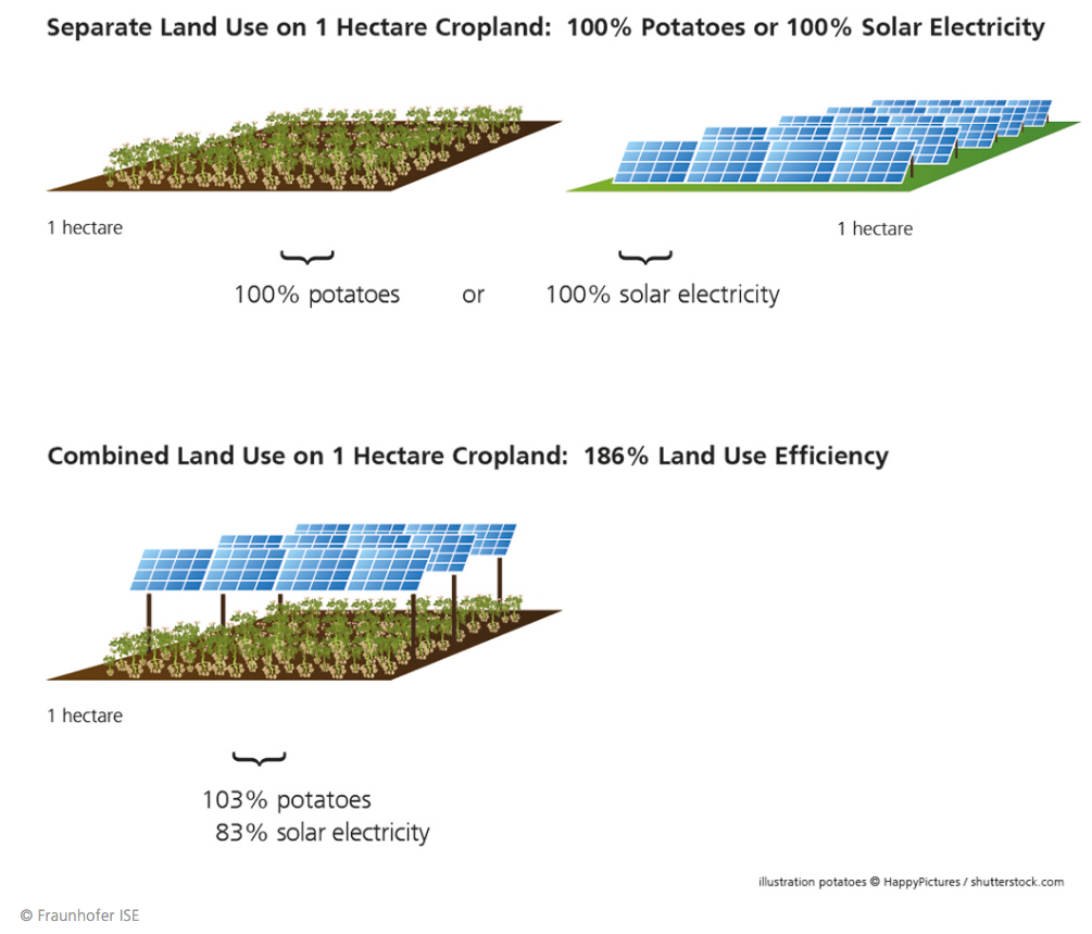 Lo schema sotto illustra il concetto di “efficienza combinata nell’uso del suolo” per produrre al contempo energia elettrica e cibo, risolvendo così la diatriba “food or fuel” che spesso accompagna le decisioni su come sfruttare correttamente gli spazi coltivabili.