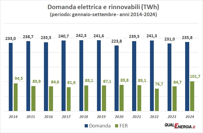 Nel grafico qui sotto l’andamento della domanda di energia elettrica e la generazione da rinnovabili nei primi nove mesi degli anni dal 2014 al 2024.