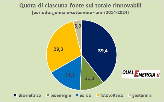 Nel grafico la quota percentuale delle diverse fonti rinnovabili sul fabbisogno elettrico in Italia nei primi tre trimestri 2024.