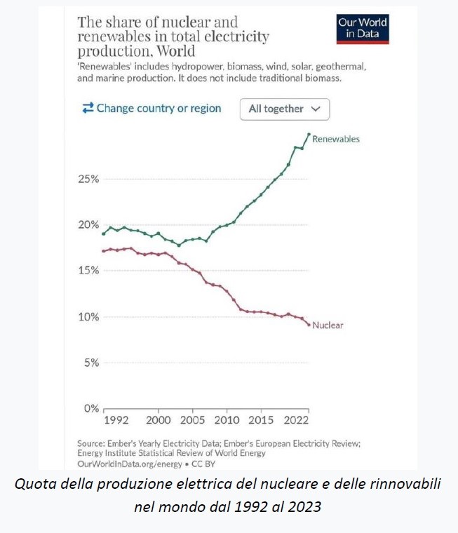 C’è poi la vicenda delle centrali atomiche che nel mondo vedono un calo percentuale del loro contributo, a fronte della crescita rapidissima delle energie rinnovabili (si veda il grafico).