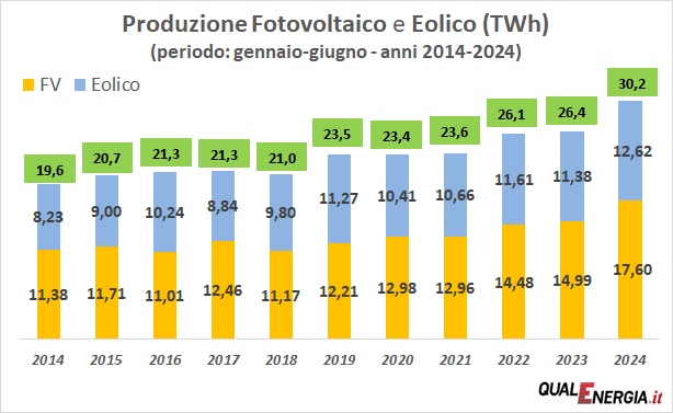 Insieme fotovoltaico ed eolico hanno prodotto 30,2 TWh, il massimo di sempre per il periodo considerato, come si può vedere dal grafico dal 2014 ad oggi (10,6 TWh in più del 2014).