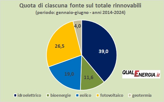 Nel primo semestre eolico e fotovoltaico, insieme, rappresentano il 45,5% di tutta la generazione da rinnovabili elettriche. L’idroelettrico è al 39%.