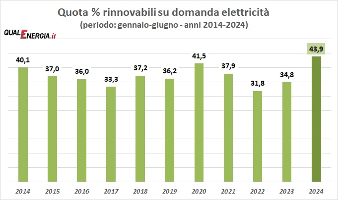 Anche la copertura della domanda con le rinnovabili elettriche del semestre 2024 ha registrato un record: 43,9%, come si può vedere dal grafico qui sotto.