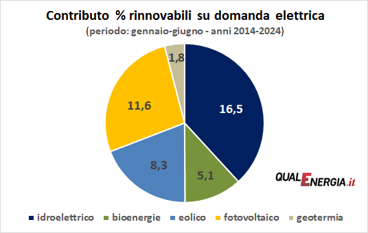 Vediamo in quest’altro grafico il contributo percentuale nel semestre delle diverse fonti rinnovabili sul fabbisogno elettrico in Italia.