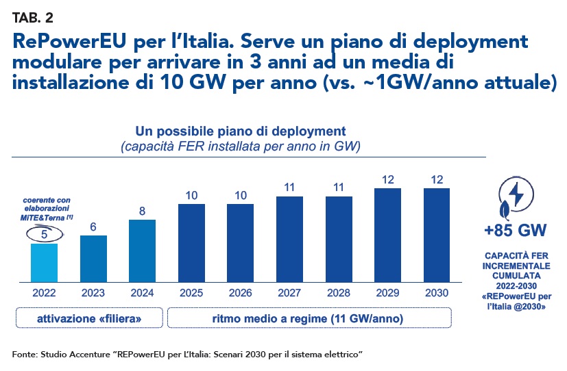 Il primo è lo studio condotto da Accenture “REPowerEU per L’Italia: Scenari 2030 per il sistema elettrico” (tab. 1 e tab. 2) che, partendo dall’evoluzione della domanda elettrica, analizza gli scenari per l’Italia delineati dagli obiettivi rinnovabili proposti dalla Commissione con il pacchetto REPowerEU e traccia la road map 2030 del settore elettrico.
